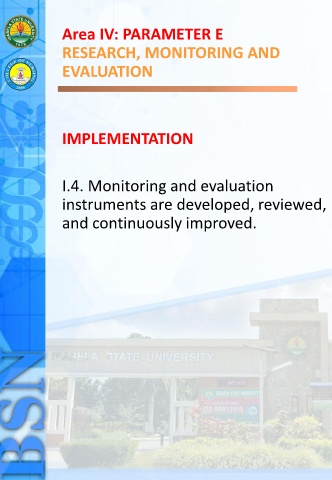 Area IV: PARAMETER E RESEARCH, MONITORING AND EVALUATION IMPLEMENTATION I.4. Monitoring and evaluation instruments are developed, reviewed, and continuously improved.