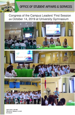 OFFICE OF STUDENT AFFAIRS & SERVICES Congress of the Campus Leaders' First Session on October 14, 2019 at University Gymnasium ISUE-OSS-AAR-088 Effectivity: January 13, 2015 Revision:0