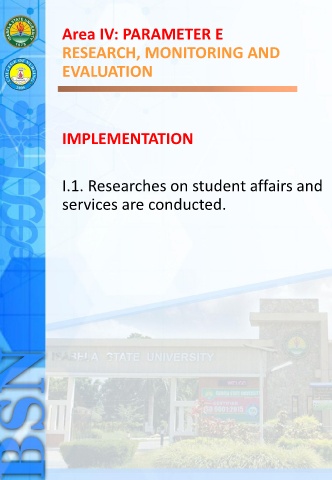Area IV: PARAMETER E RESEARCH, MONITORING AND EVALUATION IMPLEMENTATION I.1. Researches on student affairs and services are conducted.