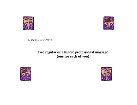 User is entitled to: Two regular or Chinese professional massage (one for each of you)