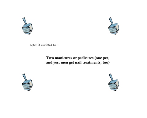 User is entitled to: Two manicures or pedicures (one per, and yes, men get nail treatments, too)