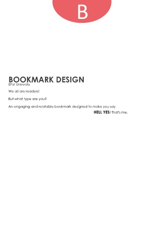 B BOOKMARK DESIGN Effat University We all are readers! But what type are you? An engaging and relatable bookmark designed to make you say HELL YES! That's me.