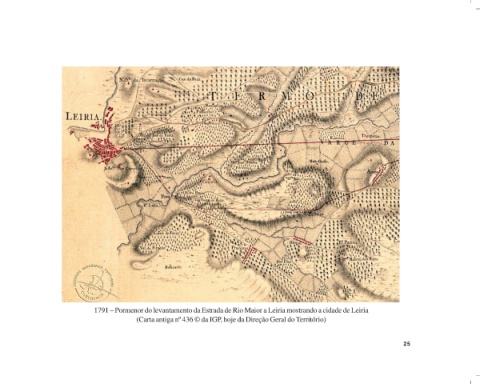 1791 – Pormenor do levantamento da Estrada de Rio Maior a Leiria mostrando a cidade de Leiria (Carta antiga nº 436 © da IGP, hoje da Direção Geral do Território) 25