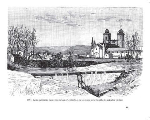 1894 - Leiria mostrando o convento de Santo Agostinho, o rio Lis e uma nora. Desenho do natural de Cristino 95