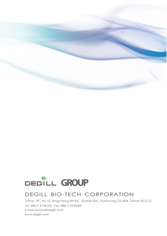 GROUP DEGILL BIO-TECH CORPORATION Office : 9F., No.10, Mingcheng 4th Rd., Gushan Dist., Kaohsiung City 804, Taiwan (R.O.C) Tel : 886-7-9740100 Fax : 886-7-9740200 E-mail:service@degill.com www.degill.com
