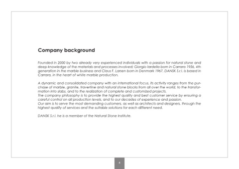 generation in the marble business and Claus F. Larsen born in Denmark 1967, DANSK S.r.l. is based in