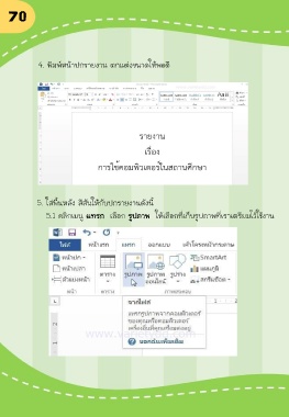 70 4. พิมพ์หน้ำปกรำยงำน ตกแต่งขนำดให้พอดี 5. ใส่พื้นหลัง สีสันให้กับปกรำยงำนดังนี้ 5.1 คลิกเมนู แทรก เลือก รูปภำพ ให้เลือกที่เก็บรูปภำพที่เรำเตรียมไว้ใช้งำน