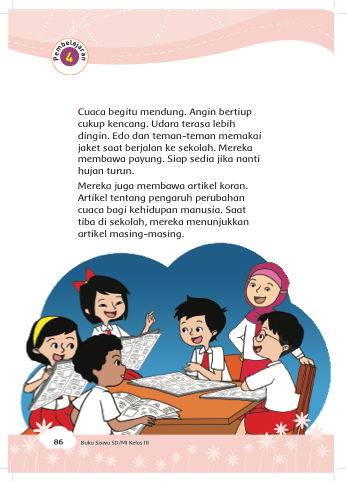 Mereka juga membawa artikel koran. Artikel tentang pengaruh perubahan cuaca bagi kehidupan manusia. Saat tiba di sekolah, mereka menunjukkan artikel masing-masing.