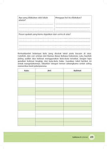 Perhatikanlah beberapa kata yang dicetak tebal pada bacaan di atas. Catatlah, dan cari artinya dari Kamus Besar Bahasa Indonesia. Lalu, buatlah paling sedikit dua kalimat menggunakan kata-kata tersebut. Jangan lupa gunakan kalimat lengkap dan kata-kata baku. Gunakan tabel berikut ini untuk mengerjakannya. Tukarkan dengan teman sebangkumu untuk saling memeriksa hasil pekerjaanmu.
