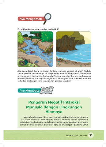 Apa yang dapat kamu ceritakan tentang gambar-gambar di atas? Apakah kamu pernah menemuinya di lingkungan tempat tinggalmu? Bagaimana pendapatmu terhadap gambar tersebut? Menurutmu, hal-hal apa sajakah yang menyebabkan hal itu terjadi? Bagaimana hubungan atau interaksi manusia terhadap lingkungan yang tampak dari gambar tersebut?