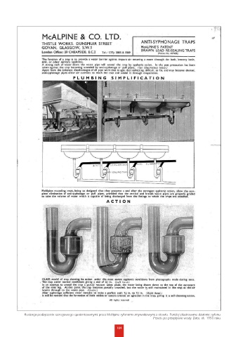 Ilustracja podłączenia szeregowego opatentowanymi przez McAlpine syfonami umywalkowymi z ołowiu. Poniżej zilustrowane działanie syfonu. Przed i po przepływie wody. Data, ok. 1950 roku. 104 104