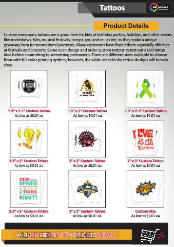 Custom temporary tattoos are a good item for kids at birthday parties, holidays, and other events