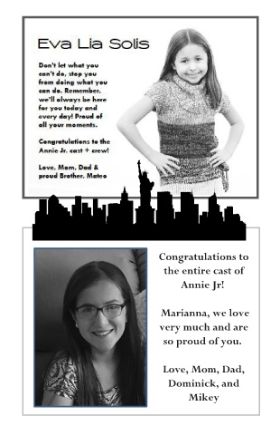 Congratulations to the entire cast of Annie Jr! Marianna, we love very much and are so proud of you. Love, Mom, Dad, Dominick, and Mikey
