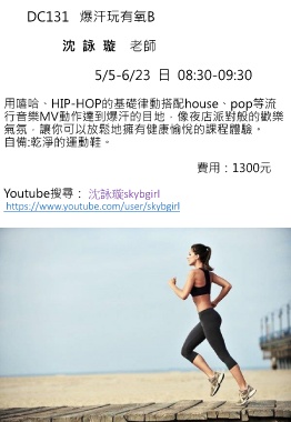 DC131 爆汗玩有氧B 沈 詠 璇 老師 5/5-6/23 日 08:30-09:30 用嘻哈、HIP-HOP的基礎律動搭配house、pop等流 行音樂MV動作達到爆汗的目地,像夜店派對般的歡樂 氣氛,讓你可以放鬆地擁有健康愉悅的課程體驗。 自備:乾淨的運動鞋。 費用:1300元 Youtube搜尋: 沈詠璇skybgirl https://www.youtube.com/user/skybgirl