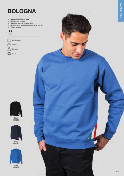 BOLOGNA • Sweatshirt Made In Italy • Ribbed round-neck • Tricolour triangle on one side • Ribbed cuffs and bottom of shirt h cm 6,5 • Felled seams MADE IN ITALY 100% Cotton 25 Pcs 280 g/m² S-XXL Black 988253 Navy 988250 Royal 988252 373