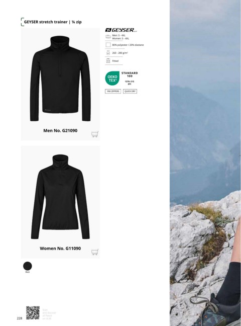 GEYSER stretch trainer | ¼ zip by ID ® Men: S - 4XL Women: S - 4XL 80% polyester / 20% elastane 260 - 280 g/m 2 Fitted YKK ZIPPERS QUICK DRY Men No. G21090 Women No. G11090 Black Scan and discover all fleece 228 on id.dk