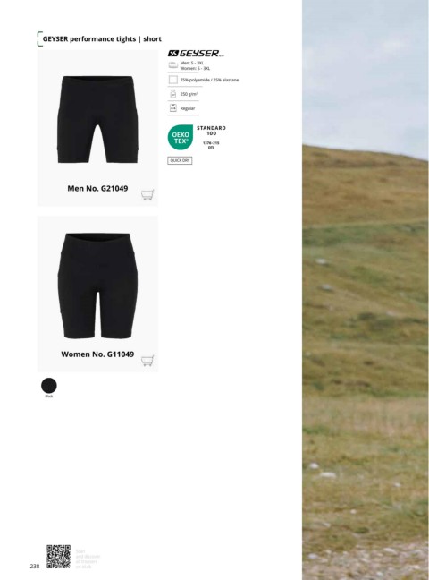 GEYSER performance tights | short by ID ® Men: S - 3XL Women: S - 3XL 75% polyamide / 25% elastane 250 g/m 2 Regular QUICK DRY Men No. G21049 Women No. G11049 Black Scan and discover all trousers 238 on id.dk