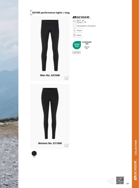 GEYSER performance tights | long by ID ® Men: S - 3XL Women: S - 3XL 75% polyamide / 25% elastane 250 g/m 2 Regular QUICK DRY Men No. G21048 COLLECTION Women No. G11048 Black by ID ® Scan and discover all trousers on id.dk 241