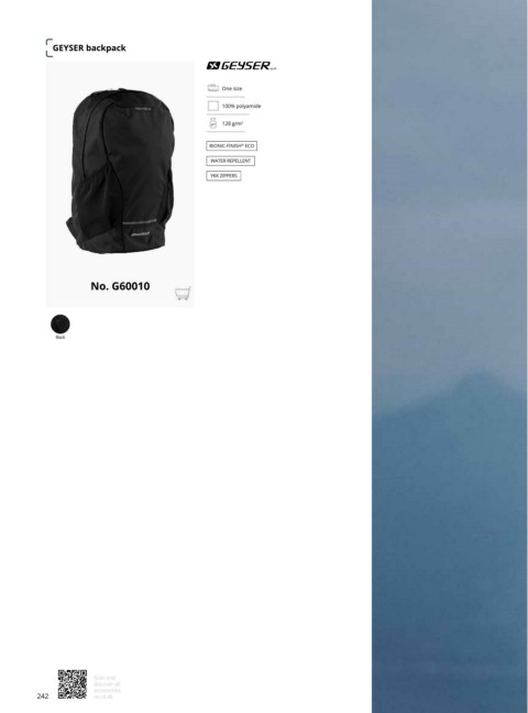 GEYSER backpack by ID ® One size 100% polyamide 128 g/m 2 BIONIC-FINISH ® ECO WATER REPELLENT YKK ZIPPERS No. G60010 Black Scan and discover all accessories 242 on id.dk