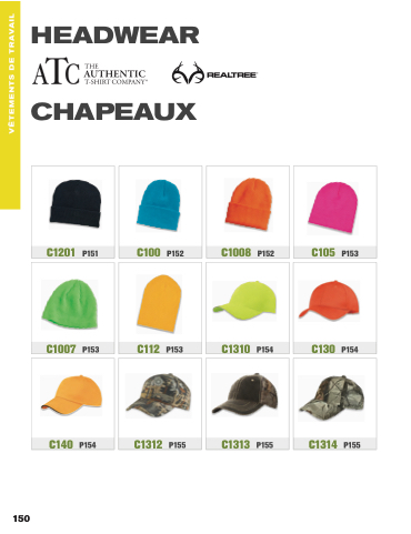 headwear chapeaux C1201 P151 C100 P152 C1008 P152 C105 P153 C1007 P153 C112 P153 C1310 P154 C130 P154 C140 P154 C1312 P155 C1313 P155 C1314 P155 150 VĂTEMENTS DE TRAVAIL