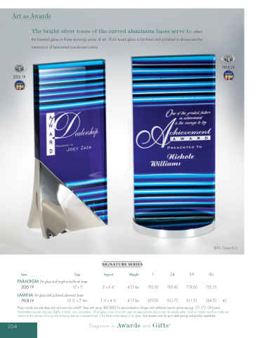 Handcrafted awards may vary slightly in nish, color and pattern. All art glass is one of a kind; sizes are approximate and no two are exactly alike. Small air bubble and ow marks are inherent in the process of fusing and slumping and are considered part of the hand made beauty of art glass. Visit rsowens.com for up to date pricing and product availability.