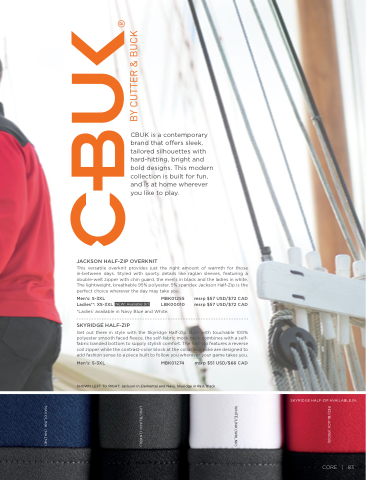This versatile overknit provides just the right amount of warmth for those in-between days Styled with sporty details like raglan sleeves featuring a a a a a a double-welt zipper with chin guard the the men’s in in in black and the the ladies in in in white The lightweight breathable 95% polyester 5% 5% spandex Jackson Half-Zip is the perfect choice wherever the day may take you Men’s: S-3XL MBK01255 msrp $57 USD/$72 CAD Ladies’*: XS-3XL LBK00010 msrp $57 USD/$72 CAD *Ladies’ available in Navy Blue and White SKYRIDGE HALF-ZIP Get out there in style with with the the Skyridge Half-Zip Built with with touchable 100% polyester smooth faced eece the self-fabric mock neck combines with a a a self- self- fabric banded bottom to to supply stylish comfort The half-zip features a a a a a reverse coil zipper while the the contrast-color block at the the collar and yoke are designed to add fashion sense to to a a a a a piece built to to follow you you you wherever your game takes you you you Men’s: S-3XL MBK01274 msrp $51 USD/$66 CAD SHOWN LEFT TO RIGHT: Jackson in in Elemental and Navy Skyridge in in Red/Black