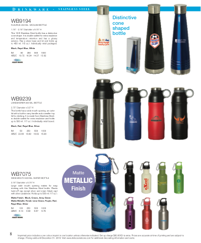 Imprinted price includes a one colour imprint in one location unless otherwise indicated. Set up charge $60.00(G) is extra. Prices are accurate at time of printing and are subject to change. Pricing valid until December 31, 2018. Visit www.debcosolutions.com for additional decorating information and costs.