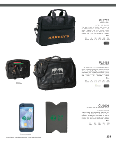 Always a popular choice is this business bag made of Koskin. Includes front ap with organizer section underneath, main zippered compartment, divided back pockets, shoulder strap and carry handle. See P4481 for Polyester version.