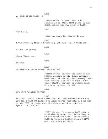 (LEVI stands. He stares. BASS slowly nonchalantly moves his JACKET away so he can reach his GUNS. GRANT slowly walk SL to get a better view of LEVI who is staring at BASS)