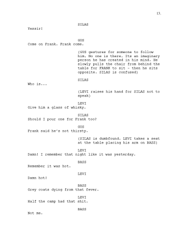 (GUS gestures for someone to follow him. No one is there. Its an imaginary person he has created in his mind. He slowly pulls the chair from behind the table for FRANK to sit - then he sits opposite. SILAS is confused)