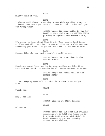 (GRANT takes his GUN from his HOLSTER extending it to LEVI who takes it in his hand. BASS stands with drink in hand. Observing yet not drawing attention to himself)