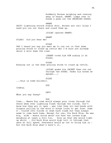 Cows... Massa Roy cows would always pour loose through the fence when ever lightning flash through the clouds. Don’t know how they pry it open - was like they all had hands with fingers pulling on the wood to break loose to get free. Some d - toured into fields or down back roads but they always seem to come back home. Except for one. Ole Buck Blue. He was big, wide - musta stood about six feet two inches high weighing at least a full ton. Soon as that sky would light up white - Old Buck Blue would high tell it through that gate at full speed. Overseers would go out to bring him in - but Old Buck Blue what’n have’n it.