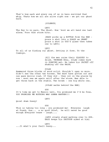 (BASS picks up a BOTTLE from the BAR - pours a shot into a GLASS as GRANT pours a shot in GUS’S glass then takes one to LEVI)