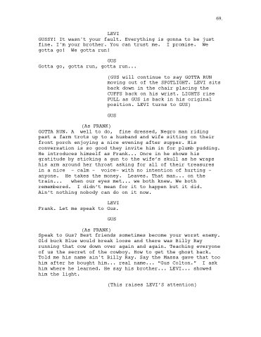 Speak to Gus? Best friends sometimes become your worst enemy. Old buck Blue would break loose and there was Billy Ray running that cow down over again and again. Teaching everyone of us the secret of the cowboy. How to get the ghost back. Told me his name ain't Billy Ray. Say the Massa gave that too him after he bought him... real name... “Gus Colton.” I ask him where he learned. He say his brother... LEVI... showed him the light.