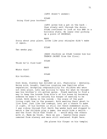 Dont know. Slavery has divided us all. Physically - mentally. Being sold, bought, families creating new families after separation. Accepting responsibility for children who were not even yours. Levi was willing to hang for what he thought was his brother’s ill-gotten gains. Frank wanting to find a way to keep the hounds from bite’n at his bones by becoming someone he wasn't to satisfy his hunger of wanting to be loved. Both dying on the inside - the scars of the past living right now in the present. Both wanting their ghost to live free. Just like the cowboys. Levi got a chance to make it right. If his brother is still out there somewhere alive. I was riding through Fort Smith few weeks back and stopped to watch a few children play a game. One would hide a switch - and the first child that found it - would whip the others with it. Made me think. Here we are - twenty-three years removed from slavery and were still enslaved. Right here.