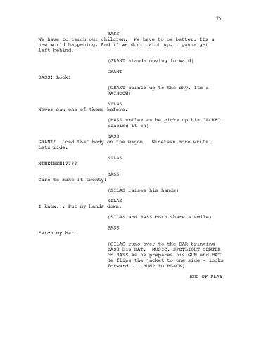 (SILAS runs over to the BAR bringing BASS his HAT. MUSIC. SPOTLIGHT CENTER on BASS as he prepares his GUN and HAT. He flips the jacket to one side - looks forward.... BUMP TO BLACK)