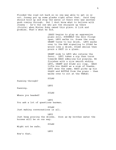 (BASS begins to play an aggressive piano solo. SUDDENLY the door flings open. LEVI walks in. Scans the room. GRANT turns to his drink. LEVI walks over to the BAR signaling to SILAS he would like a drink. SILAS smiles then pours a SHOT in a glass.