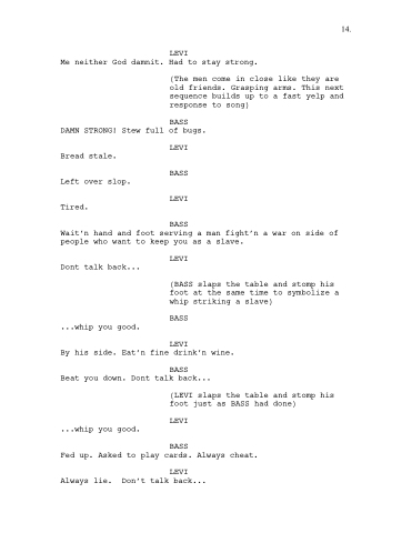 (BASS slaps the table and stomp his foot at the same time to symbolize a whip striking a slave)