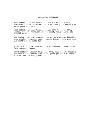 LEVI COLTON, African American, late 30's to early 40's, leader, deadly, conniving, horse thief, manipulator. Big brother to Gus.