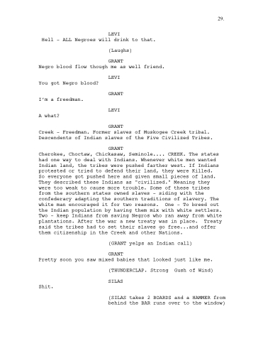 had one way to deal with Indians. Whenever white men wanted Indian land, the tribes were pushed farther west. If Indians protested or tried to defend their land, they were Killed. So everyone got pushed here and given small pieces of land. They described these Indians as "civilized." Meaning they were too weak to cause more trouble. Some of these tribes from the southern states owned slaves - siding with the confederacy adapting the southern traditions of slavery. The white man encouraged it for two reasons. One - To breed out the Indian population by having them mix with white settlers. Two - keep Indians from saving Negros who ran away from white plantations. After the war a new treaty was in place. Treaty said the tribes had to set their slaves go free...and offer them citizenship in the Creek and other Nations.