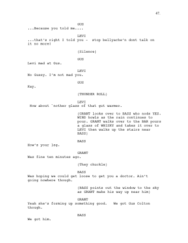 (GRANT looks over to BASS who nods YES. WIND howls as the rain continues to pour. GRANT walks over to the BAR pours a glass of WHISKY and takes it over to LEVI then walks up the stairs near BASS)