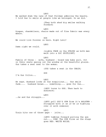 (LEVI tumbles forward pulling the gun out.... POW! The GUN fires as the stage goes RED. WHITE NOISE.