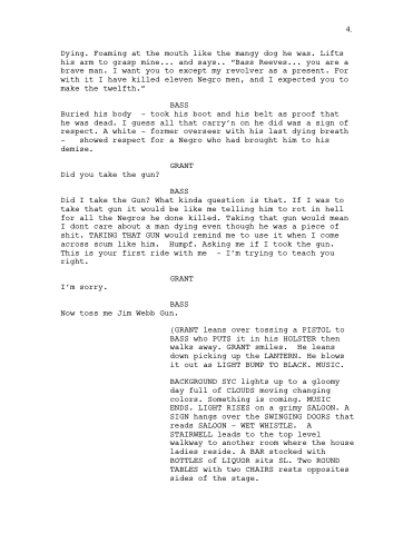(GRANT leans over tossing a PISTOL to BASS who PUTS it in his HOLSTER then walks away. GRANT smiles. He leans down picking up the LANTERN. He blows it out as LIGHT BUMP TO BLACK. MUSIC.