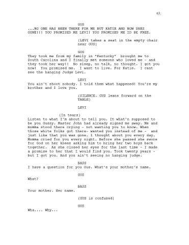 Listen to what I’m about to tell you. It what’n supposed to be you Gussy. Master John had already signed me away. Me and momma stood there crying - not wanting you to know. When those white folks got there- wanted you instead of me - and just like that you was gone. I thought about you every day. Momma cried for you every night. Before she passed she swore for God on her knees asking him to bring her two boys back together. As she closed her eyes for the last time - I made a promise to her that I would find you. Took twenty years - but I got you. And you ain’t seeing no hanging judge.
