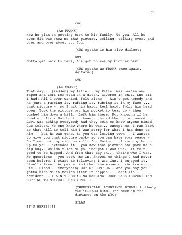 raped and left for dead in a ditch. Covered in shit. She all I had! All I ever wanted. Felt alone - Ain’t got nobody and he just a rubbing it, rubbing it, rubbing it in my face ... that picture - so I hit him hard. Real hard. Split his head open. Took the picture out his pocket to tear up - then pushed him down a hill. Left him there. Not knowing if he dead or alive. Got back in town - heard that a man named Levi was asking everybody had they seen or know anyone named Gus Colton. No one knew where he was... except me. I ran back to that hill to tell him I was sorry for what I had done to him - but he was gone. As you was leaving town - I wanted to give you that picture back- so you can have your peace - So I can have my mine as well- for Katie. I rode my horse up to you - extended it - you saw that picture and gave me a big hug. Wouldn't let me go. Thought I was Gus. It felt good to be hugged. And from that day on... that’s who I was. No questions - you took me in. Showed me things I had never seen before. I start to believing I was Gus. I enjoyed it. Finally free. At peace. And then the woman on the train.... Die - Blood - everything OUT OF CONTROL - and you say you gotta hide me in Mexico after it happen - I cant die - accident - I AIN’T SEEING NO HANGING JUDGE BASS REEVES! I'M GETTING TO MEXICO! LONG GONE!!!