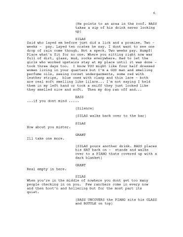 weeks - pay. Layed ten crates he say. I dont want to see one drop of rain come though. Not a speck. Two weeks pay. Humpf! Place what'n fit for no one. Where you sitting right now was full of dirt, glass, mud, rocks everywhere. Had to let the girls who worked upstairs stay at my place until it was done - took three days too. I know YOU might like four half dressed women living in your quarters but I’m a GOD man and smelling perfume oils, seeing corset undergarments, some red with leather strips, blue ones with clasp and thin lace - both are real soft smelling like lilacs... I'm not saying I held them in my left hand or took a sniff they just looked like they smelled nice and soft. Then my dog ran off and...