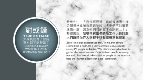 大家真的為了保持 人們說時尚界大家都不吃飯這種刻板印象。」