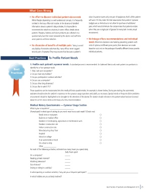 assistant should review the patient’s responses to the eyewear usage questions and clarify, as necessary. Special needs or frequent vision problems