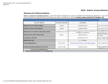 Welcome to Essilor Video Essilor Vision Foundation Register for ECP University Computer Set Up Office Set Up Lab Organization Understanding Optical Practices C:\Users\MDean\Desktop\Essilor Sales 101 Training Agenda.xlsx