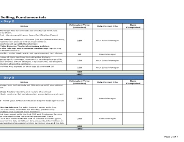 Notes 1. If your Sales Manager has not already set this day up with you, Set up your first ride‐along with your Apex Certification Expert 3. Things to cover today: complete HR forms (I‐9, etc.)Review territory, Sales Goals, compensation plan as well as expectations. 5. Review Sum Total Expense Tool and company policies. 6. Call and meet the Lab Mgr and Customer Service Mgr supporting order business cards, , order credit card, s